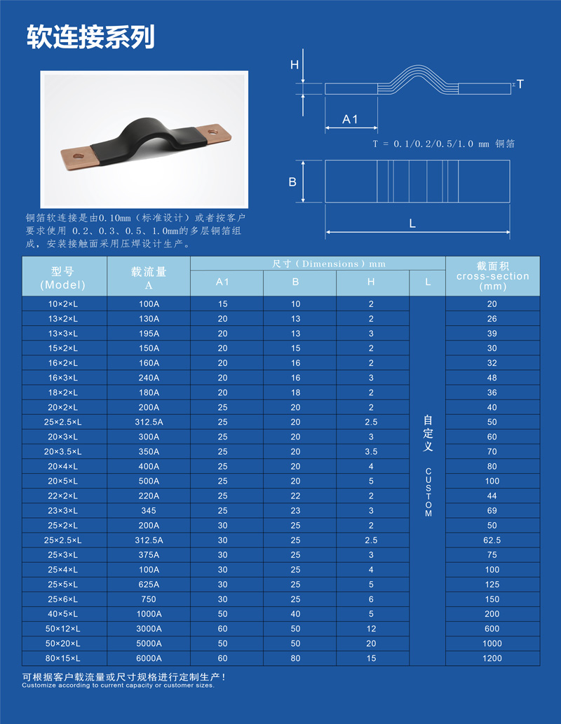 銅排軟連接采用T2無氧銅箔,經(jīng)分絲處理,通過高分子擴(kuò)散焊接,整體或表面可鍍銀或鍍錫。 材質(zhì):T2無氧銅 鍍層:表面鍍銀或鍍錫 接觸面:長度可按安裝要求設(shè)計(jì) 鉆孔:標(biāo)準(zhǔn)設(shè)計(jì)無鉆孔,可按圖紙要求定制 絕緣材料:標(biāo)準(zhǔn)設(shè)計(jì)無絕緣材料,可按要求使用PVC絕緣套管并熱縮固定 優(yōu)勢:我們是唯一一家既做軟連接,也做浸塑的企業(yè) 特殊設(shè)計(jì):可按圖紙要求定制 尺寸:按圖紙要求定制